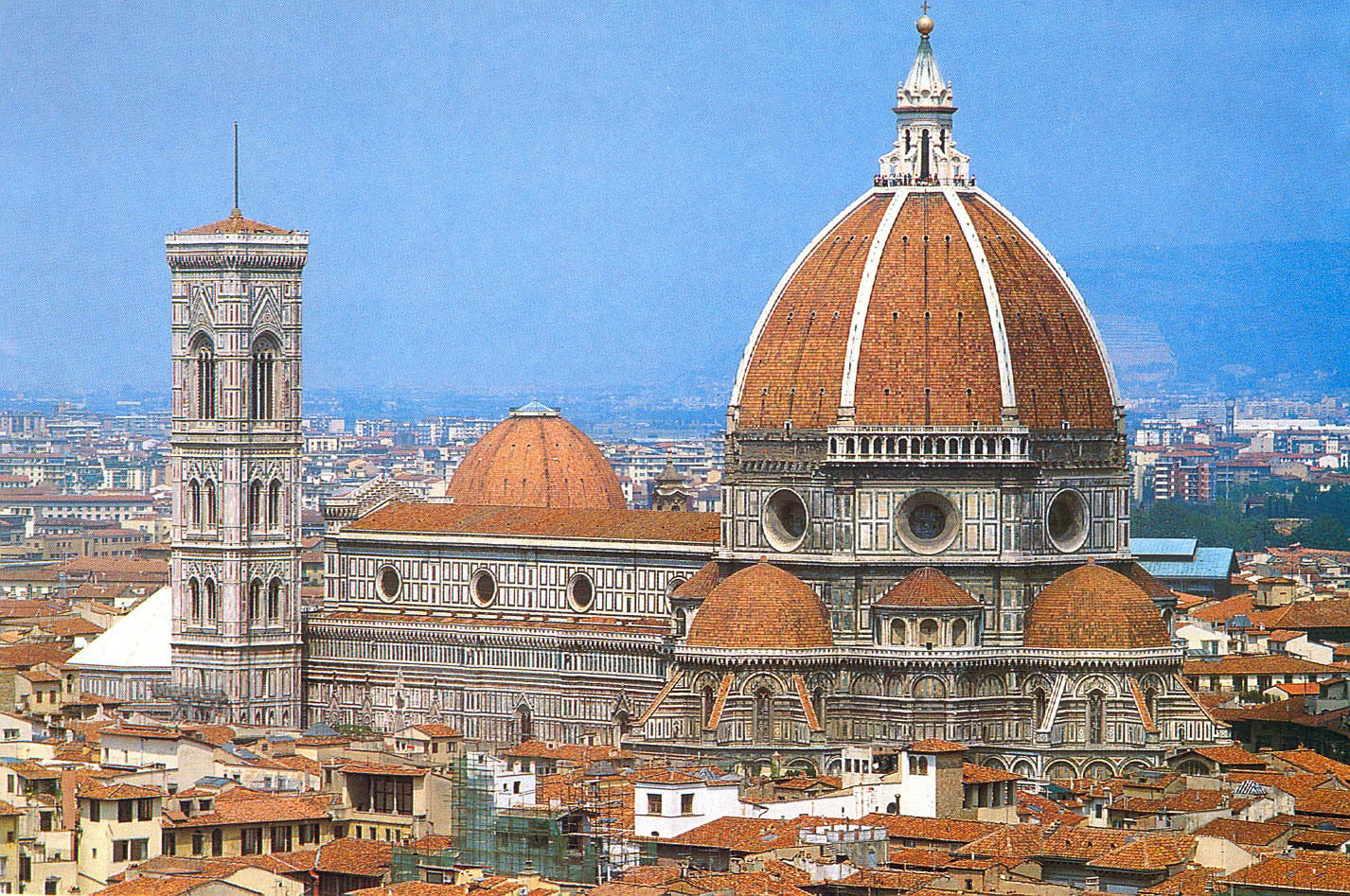 Se trata de la cúpula de la catedral de Florencia. Santa María de las Flores es una catedral gótica, iniciada en 1296 por el arquitecto Arnolfo di Cambio y continuada desde 1331 por Giotto, quién realizó su bello campanile exento, y posteriormente por otros arquitectos. La catedral tiene planta de cruz latina con tres naves.