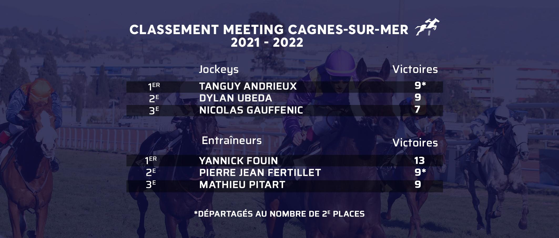Y.-. A. Briand - 13 victoires - 30 places. Alors que les sauteurs sont encore en piste jusqu'à la fin du mois, Cagnes lance demain son meeting de trot avec la première des vingt-huit réunions de l'hiver. Le point sur ce meeting cagnois en quelques chiffres et éléments-clés.